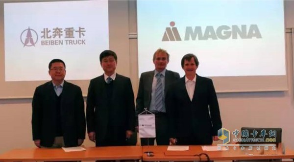 2017年3月14日,在奧地利,北奔重汽與MAGNA旗下位于圣瓦倫丁的斯太爾工程技術中心(簡稱ECS公司)簽訂了戰略合作意見書。北奔重汽董事長、黨委書記王世宏,總工程師周亞偉代表北奔重汽與ECS公司負責人克勞斯和法務代表格哈德共同簽署協議。北奔重汽相關領導和項目工作小組參加了簽字儀式。