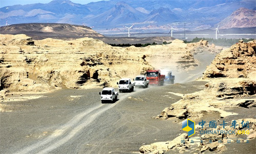 在吐魯番一處長坡上,一輛滿載的締途雙排新車正拖拽著一輛奧馳中卡緩慢行駛著。這是締途雙排車型正在進行整車熱平衡試驗的現(xiàn)場。