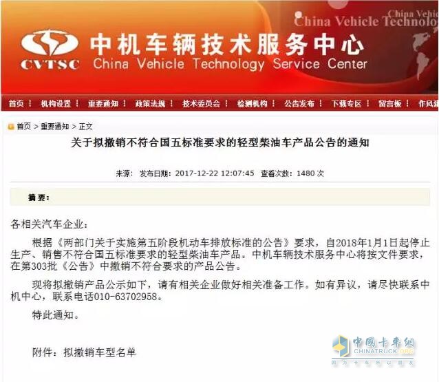2017年12月22日,中機中心網站發出通知。根據《兩部門關于實施第五階段機動車排放標準的公告》要求,自2018年1月1日起停止生產、銷售不符合國五標準要求的輕型柴油車產品。中機車輛技術服務中心將按文件要求,在第303批《公告》中撤銷不符合要求的產品公告。