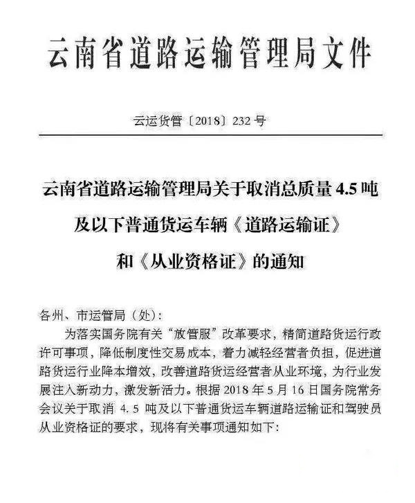 2018年11月13日,云南省道路運輸管理局發(fā)布了《關于取消總質(zhì)量4.5噸及以下普通貨運車輛道路運輸證和從業(yè)資格證的通知》。