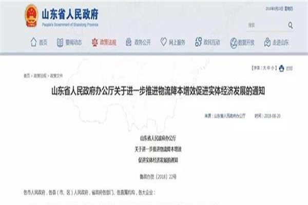 2018年8月20日,山東省人民政府辦公廳發(fā)布了《山東省人民政府辦公廳關于進一步推進物流降本增效促進實體經(jīng)濟發(fā)展的通知》。