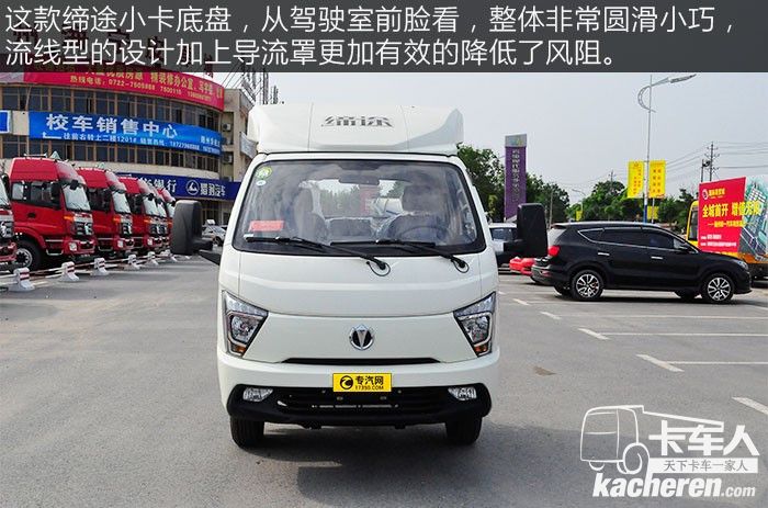 這款締途小卡底盤,從駕駛室前臉看,整體非常圓滑小巧,流線型的設計加上導流罩更加有效的降低了風阻,基本接近乘用車的標準,這就大大降低了油耗。