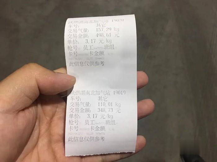 去程:出發時在天津王官屯加滿氣,氣價為2.85元。中途在渭南西服務區進行補氣,一共補氣267.3公斤,表顯行駛里程為1000.65公里,單價為3.17元。花費847元。