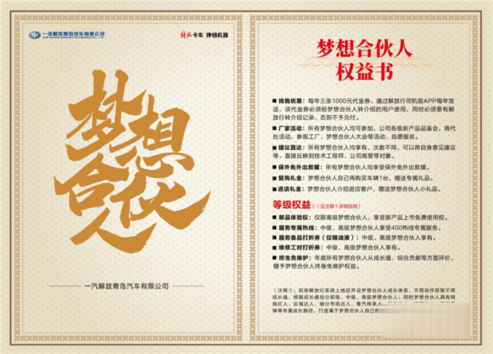 2021年,解放青汽開啟"夢想合伙人"計(jì)劃,馮先生受邀加入,成為首批名人堂成員,從此可享各項(xiàng)專享權(quán)益福利,"這是一份榮譽(yù),對于軍人而言,榮譽(yù)感非常重要",馮先生說:"企業(yè)信任我,卡友們也信任我,因此我會更加努力,幫助更多卡友。勿以善小而不為,從身邊的點(diǎn)滴入手,讓我們大家庭中的每個人感受到溫暖和關(guān)愛。"