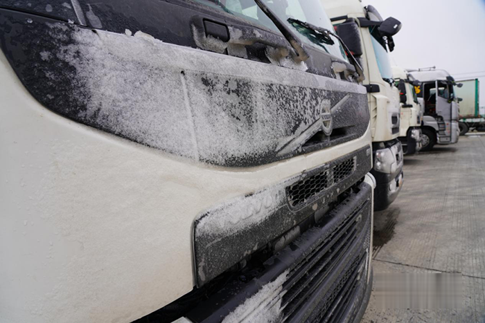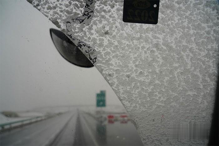 車輛駛?cè)牍埽驗(yàn)轱L(fēng)雪太大,高速封閉,兩位師傅只能到避風(fēng)區(qū)等待,到了避風(fēng)區(qū)發(fā)現(xiàn),車頭已經(jīng)結(jié)成了冰。