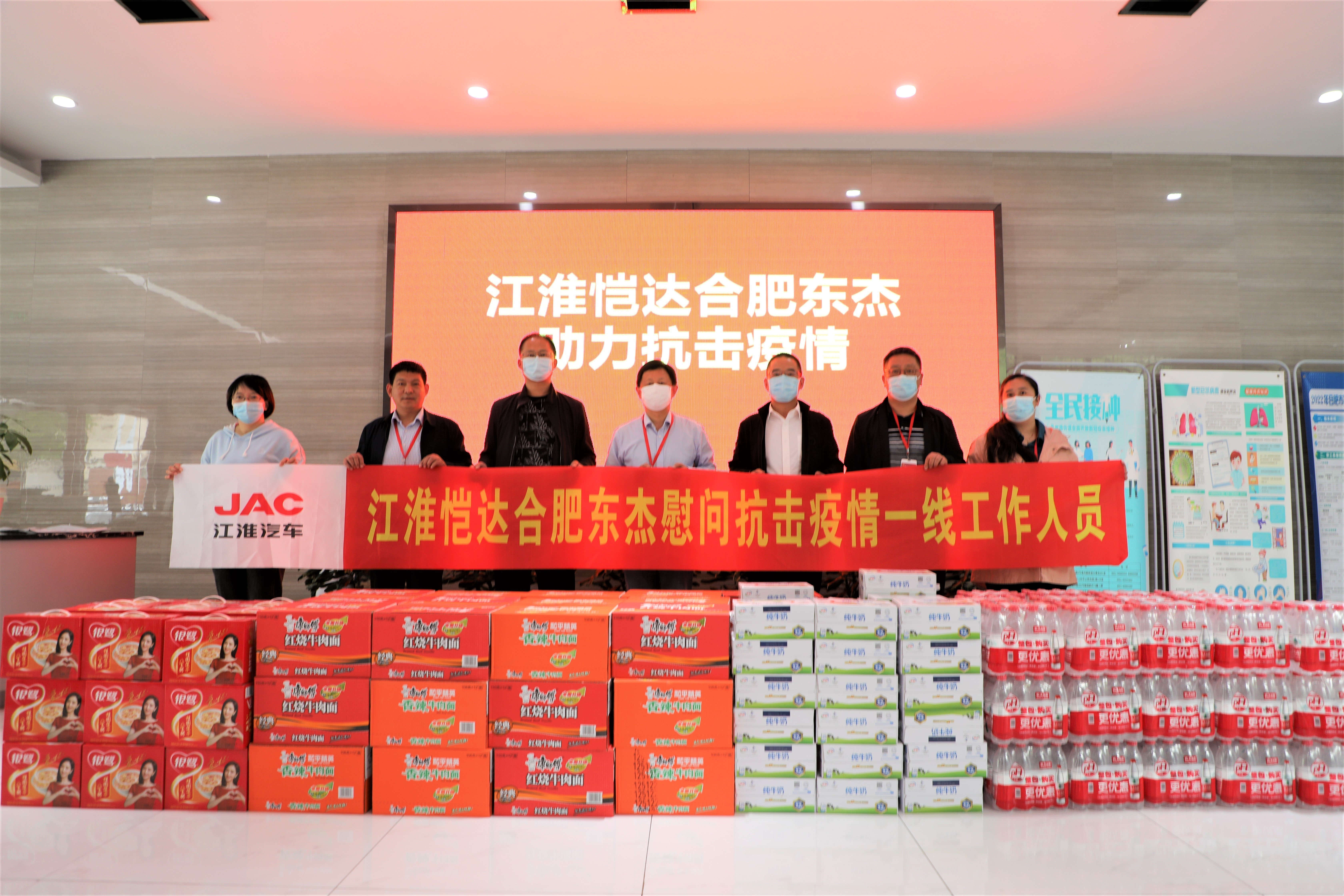 2022年4月16日,江淮愷達一級經銷商合肥東杰在得知將要全合肥演練的消息后,自主采購純凈水、奶、八寶粥、方便面等生活物資各40箱,慰問廬陽區亳州路街道一線抗疫人員,并為防疫點儲備物資以便為日夜不停保障運輸生命線的貨車司機提供免費的物資便利。