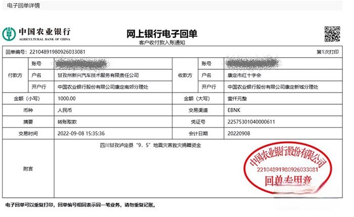 截止9月8日晚,甘孜新興累計檢修東風車96臺次,服務災區加油站、應急分隊發電機等設備17臺次,贈送冷凍油、機油等配件1萬余元,服務災區群眾46人次,贈送3000余元生活物資,并向康定市紅十字會捐款1000元。