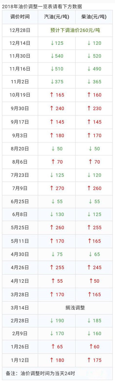 2018年油價調整一覽表